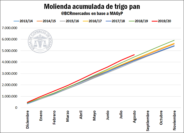 Los molinos procesaron 507.642 toneladas de trigo pan en el mes de agosto, un 11% por debajo del mes de julio, y un 4,6% por debajo del año pasado en el mismo mes. Sin embargo, la industrialización del cereal estuvo muy alta en los primeros meses de la campaña, acumulando 4.654.498 toneladas en el período diciembre-agosto, lo que supera al año previo en torno al 5% (unas 200.000 toneladas adicionales), y marca el mayor valor en los registros. El trigo candeal presenta una dinámica similar, habiéndose procesado 227.918 toneladas, 17% por encima de la campaña previa.