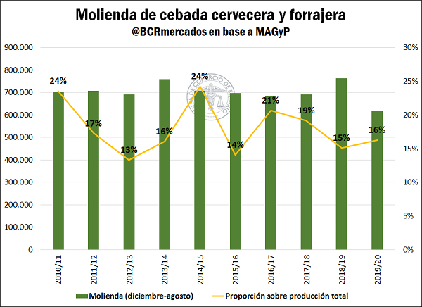 La molienda de cebada cervecera en lo que va de la campaña 2019/20 se ubicó en el nivel más bajo en los últimos 13 años con 591.304 toneladas, un 20% por debajo de la campaña previa. El consumo de cerveza en la población fue afectada negativamente por los efectos de la pandemia de COVID-19, lo que generó una caída en la actividad de la industria cervecera en lo que va del año. A su vez, la caída en la producción de cebada entre campañas (5,1 Mt en 2018/19 vs 3,8 Mt en 2019/20) afecta el saldo disponible para el principal sector interno demandante del cereal.