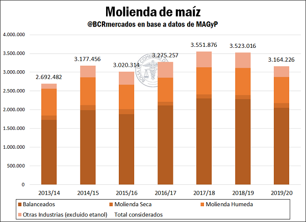 Por último, la industrialización de maíz cayó en lo que va de la campaña cayó un 10% en relación a la campaña previa, sin considerar su utilización para producción de etanol. Su principal uso, la elaboración de alimentos balanceados cayó en similar proporción, utilizando 2.051.306 toneladas del cereal en lo que va de la campaña 2019/20 (abril-agosto).