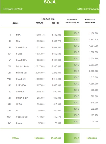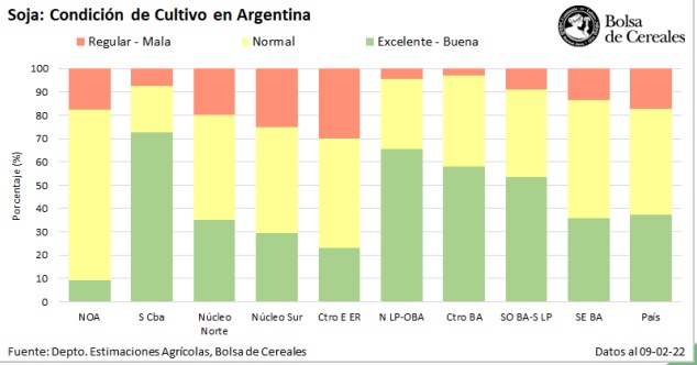 Sobre el centro, amplios sectores informan daños por ataque de trips y arañuelas y una importante variabilidad en la condición de cultivo. Mientras que el Centro-Norte de Santa Fe y el Núcleo Norte continúan informando una condición hídrica regular como consecuencia de los escasos y heterogéneos registros de precipitaciones, el Sur de Córdoba, el Norte de La Pampa-Oeste de Buenos Aires y el Centro de Buenos Aires reportan excesos hídricos, siendo los lotes tendidos los más afectados e incluso reportando pérdidas de área de hasta 6% que podrían afectar nuestra estimación nacional de superficie