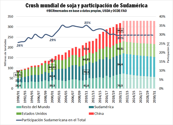 A lo largo de las últimas tres décadas, Sudamérica cuadruplicó el volumen de soja industrializada, pasando de 22,2 Mt en 1990/91 a 94,4 Mt en 2020/21. Durante las primeras 20 campañas del análisis (1990/91-2009/10) el crush regional creció a una tasa promedio anual del 6%. En igual período, la industrialización del poroto en Estados Unidos creció a una tasa anual promedio del 2%. Con esto, EE.UU. cedió el primer puesto como mayor procesador mundial de soja a la región sudamericana en la campaña 2001/02. China, por su parte, mostró un desempeño extraordinario expandiendo su producción a una tasa media anual del 15% durante los ciclos 1990/91-2009/10.