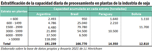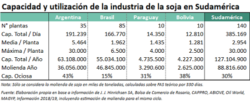 En cuanto a la capacidad de molienda de oleaginosas, la República Popular China es el país que mayor número de plantas tiene; seguida por Brasil, Estados Unidos y Argentina. A nivel agregado, el cono sur suma 140 fábricas localizadas en Argentina, Brasil, Paraguay y Bolivia. La capacidad diaria de molienda de las plantas sudamericanas combinadas alcanza 383.649 toneladas, menos de 100.000 tn/d por debajo de la capacidad diaria de la industria china (465.000 tn/d). De hecho, sólo en los últimos dos años el gigante asiático ha logrado superar la capacidad diaria de molienda sudamericana, que previamente lideraba este ránking. Argentina, en particular, tiene la mayor capacidad de molienda diaria de soja en la región (191.239 tn/d).