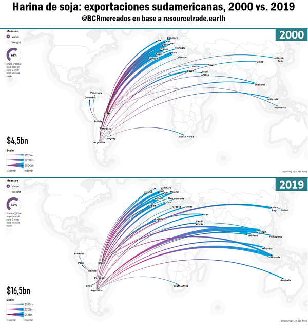 Los países sudamericanos exportan el 67% de la harina de soja que originan que en el comercio mundial representa alrededor del 65% del valor intercambiado. En las últimas décadas esta participación ha crecido, al tiempo que se han diversificado los mercados para este producto. El despegue de la industria sojera en Sudamérica responde, naturalmente, a un fuerte estímulo de la demanda que creció notablemente impulsada por un mayor consumo de harinas en la producción de carnes en Asia, principalmente en el sector porcino. Tal como se observa en el gráfico a continuación, en el año 2000 los despachos de harina de soja sudamericanos se dirigían mayormente a Europa, con envíos menores a varios puntos de Asia, África y la propia América del Sur. Para 2019, la capacidad de la industria y su producción habían dado ya un gran salto, logrando cuadruplicar el valor de la harina exportada en el 2000. Gracias al crecimiento de la industria, la región pudo intensificar el comercio con Asia. De hecho, actualmente Vietnam e Indonesia son los principales compradores de la harina proteica sudamericana.