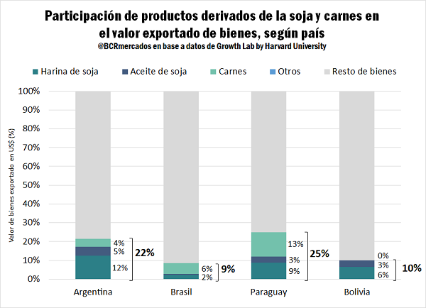 En Argentina, harina y aceite de soja aportan el 17% del valor generado por bienes en el comercio exterior, logrando la mayor participación porcentual entre los países analizados. Debe tenerse presente que Argentina es el mayor exportador global de ambos productos. El gran saldo exportable del país se explica por un limitado mercado interno (44 M hab.), que resulta muy pequeño si se lo compara con el de otros grandes industriales como Brasil, EE.UU. y China. Esto reduce las posibilidades de consumo de carne, aun cuando Argentina ostenta el consumo per cápita más alto en carne vacuna. A su vez, la combinación de su demografía y el bajo corte obligatorio de biodiesel en gasoil, también limita el consumo energético que se le puede dar a la oleaginosa. Asimismo, las recurrentes regulaciones que limitan constantemente las exportaciones de carne, obstruyen el desarrollo de las industrias bovina, porcina y aviar que no logran sostener un crecimiento de saldos exportables en el largo plazo. Actualmente, los despachos externos de carnes argentinas representan un 4% del valor total exportado. Con esto, las ventas de subproductos directos o derivados, alcanza el 22% del total en el caso argentino.