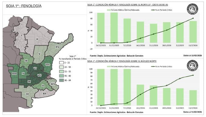 El 57,8% de la soja de primera define rinde con humedad ajustada y el 38% de la soja de segunda entra en etapa clave bajo déficit