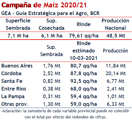 Los números de rinde de las siembras tardías siguen en vilo a la espera de nuevas lluvias y podrían afectar negativamente los guarismos de los rindes provinciales en el este de Argentina. Los maíces tardíos transitan etapas críticas, pero, en el oeste de la región Pampeana, dónde tienen mayor participación, cuentan con mejores condiciones ambientales. Por eso se mantienen sin cambios las cifras para maíz del mes pasado, sosteniendo una estimación de producción de la campaña maicera 2020/21 de 48,5 millones de toneladas.