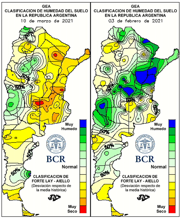 La extrema variabilidad del clima pone en jaque a la soja de segunda y al conjunto de la producción de la oleaginosa La extrema variabilidad del clima hace recordar las condiciones de extrema sequedad en las que terminó la campaña gruesa 2017/18. Febrero y los primeros diez días de marzo no dejaron lluvias importantes a gran parte del área central, en especial el este. Hay pérdidas muy graves de rindes y de superficie sembrada. Aún no es posible estimar el piso de producción con la que terminará está campaña de soja de extenderse la falta de agua. Las imágenes de la anomalía de reserva de agua en el suelo al miércoles 11 de marzo y la de hace más de un mes son elocuentes y muestran el cambio de escenario y el avance de la desecación.