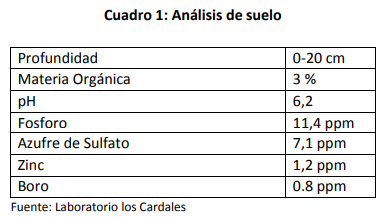 Bloque V: 60 kg/ha MAP en la línea de siembra + 60 kg/ha MAP en Cobertura total + 80 kg/a de sulfato de calcio + fungicida + Zinc y Boro La experiencia se llevó a cabo en campo cercano al paraje Norumbega, próximo a la cuidad de Nueve de julio, sobre suelo franco arenoso característico de la zona. Previo a la siembra se realizó un análisis de suelo el cual arrojo los siguientes datos. Cuadro 1