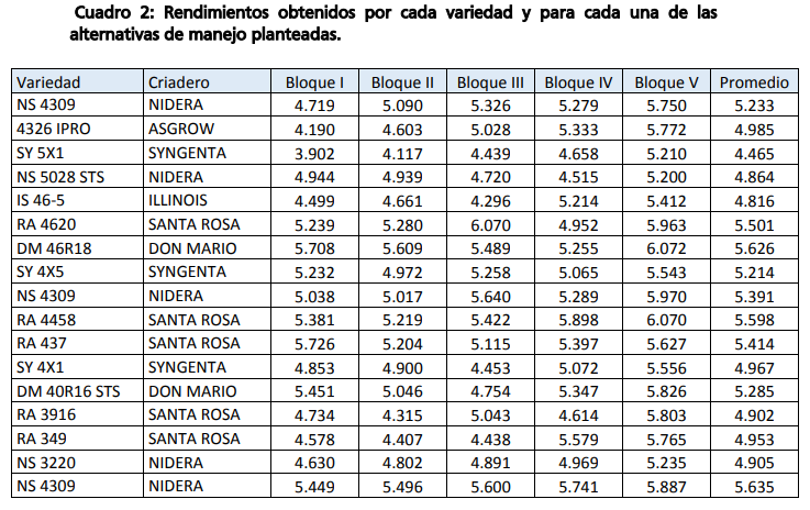 En cuanto al comportamiento varietal, los materiales que más se destacaron obedecen al grupo de madures IV largo como lo son DM 48R16, RA 4620, RA 4458, seguidas por las variedades de grupo IV corto y III Largo. Cuando el suelo no presenta impedimentos físicos, este tipo de cultivares logran un mayor desarrollo radicular, pudiendo de esta forma, hacer una mejor exploración del perfil del suelo en busca de agua y nutrientes.