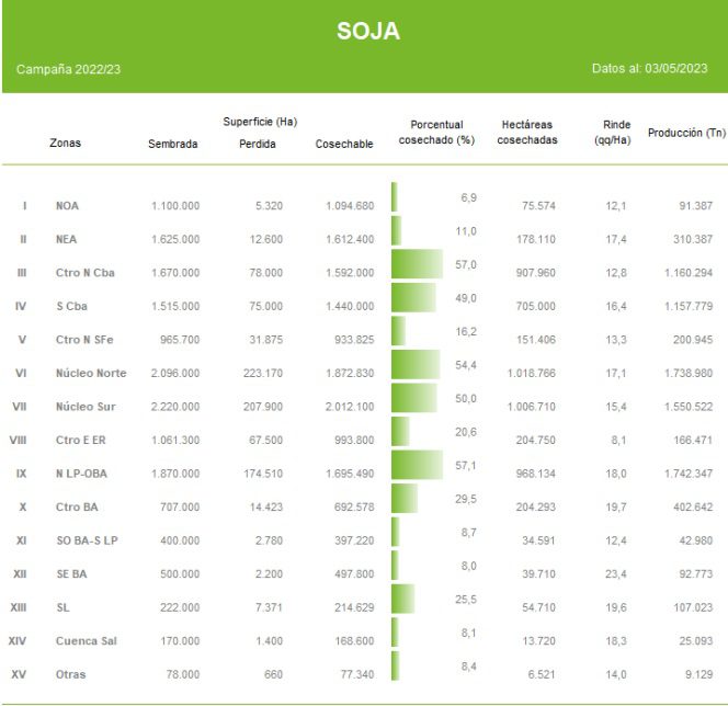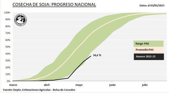 Luego de un progreso intersemanal de 8,2 puntos porcentuales, el avance nacional de cosecha cubre el 36,4 % de la superficie apta, registrando un rendimiento medio nacional de 15,8 qq/Ha. Si bien empiezan a cobrar fluidez las labores de recolección sobre el norte del área agrícola y en cuadros de segunda, la demora interanual a nivel nacional es de 18,3 p.p. Hasta la fecha, el 50,8 % y el 5,6 % de los cuadros de soja de primera y segunda ya han sido recolectados respectivamente.