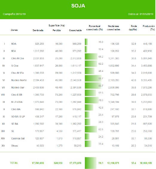 En la provincia de Córdoba, avanzó a buen ritmo la cosecha de planteos de segunda ocupación. En el Núcleo Sur, el rinde medio se ubica en 39,8 qq/Ha luego de recolectarse más de 2.000.000 de Ha. En el CentroEste de Entre Ríos, aún restan por cosechar unas 500.000 Ha. de la oleaginosa. En el extremo sur del área agrícola, los rindes se mantienen cercanos a los promedios de las últimas campañas; aunque a medida que avance la cosecha, los mismos tenderán a disminuir.