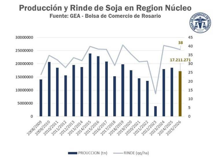 La campaña de soja en la región núcleo entra en una etapa decisiva: las precipitaciones de febrero lograron detener la caída del rinde en muchos sectores, pero el daño ya está hecho en zonas donde el agua no llegó. La primera estimación productiva se ubica en 17,2 millones de toneladas, unas 600.000 toneladas menos que lo proyectado al inicio de la campaña.