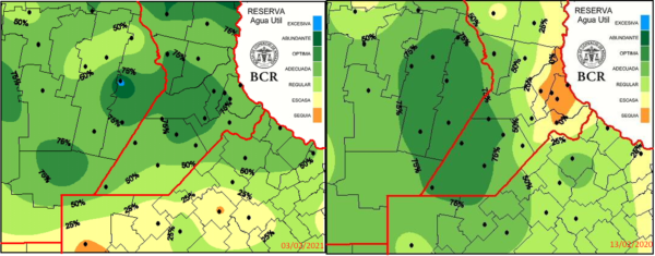 Pasó un año hasta que el mapa que considera el consumo de una pradera permanente para la región núcleo vuelva a ponerse verde. Las lluvias de la última semana fueron tan importantes que en una semana cambio todo y ahora, los colores verdes de las reservas adecuadas y óptimas ocupan el 70% del área. Las lluvias del 24 de enero al 4 de febrero superaron las expectativas de todos: se acumularon más de 100 mm en promedio. Monte Buey, en Córdoba totalizó 218,6 mm y la localidad de Montes de Oca, en Santa Fe, alcanzó 153,8 mm. La única zona que quedó con condiciones entre regulares y escasas es el norte de Buenos Aires. Allí todavía se requieren registros cercanos a los 100 mm para recomponer el perfil de humedad del suelo.