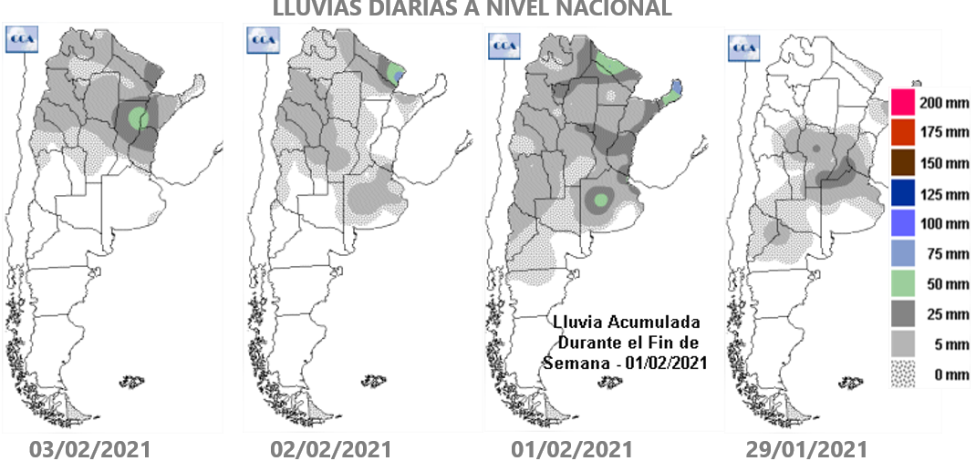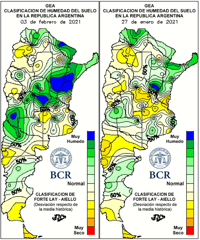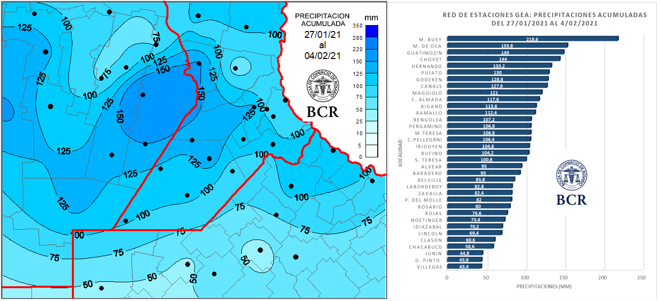 La oleaginosa perdía día a día milímetros vitales y no parecía haber manera de ganarle a la falta de agua que se arrastra desde febrero del 2020. Pero al fin el cambio de escenario se materializó. La condición de la soja de primera pasó de un 30% regular y mala al 14%. Y en condiciones muy buenas a excelente hay ahora casi 2,5 M de ha. O sea, que las regulares y malas se redujeron a la mitad y las muy buenas a excelentes ocupan el 50% del área sembrada. El porqué de esto está en que la región recibió desde el 27 de enero al 4 de febrero 100 mm de promedio. Y fue justo en la fructificación, etapa en la que ahora está el 80% de la soja. El área que ha quedado más vulnerable es el NO bonarense que recibió poco más de 40 mm. Allí, va a haber una reacción positiva pero estiman una caída irreversible de 8 a 10% en el rinde. Otra zona complicada era el oeste cordobés. Allí dicen que va a haber mermas de rinde porque había comenzado el periodo crítico sin cerrar el surco. Pero tras los 200 mm de esta semana estiman promedios de 42 qq/ha. En el centro y sur de Santa Fe estiman 40 a 45 qq/ha. Incluso en Baradero, en el castigado este bonaerense, también hablan de alcanzar 42 qq/ha de promedio. Pero las lluvias de febrero deben seguir acompañando. Aunque ahora, con los suelos cargados, la exigencia sobre el segundo mes del 2021 es muy diferente.