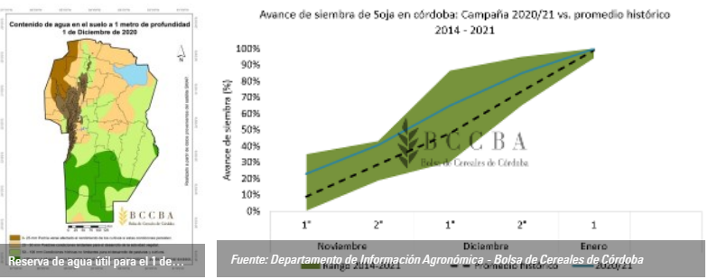 A inicios de octubre el contenido de agua en el suelo a 1 metro de profundidad reflejaba un perfil de humedad no óptimo para la siembra de los cultivos más tempranos y bajo condiciones de La Niña, motivo por el cual gran parte del sector agrícola en Córdoba tomó la decisión de ir hacia una siembra con cultivos tardíos. Así, las fechas de siembra tardías alcanzaron valores por encima del promedio en los meses de noviembre y diciembre, gracias a que las condiciones de humedad mejoraron.