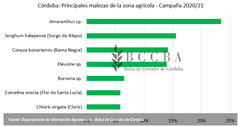 El principal factor potencialmente reductor del rendimiento contra el que tuvieron que enfrentarse los productores durante la campaña 2020/21 fue nuevamente la competencia con malezas, que debido a la falta de agua y a la resistencia creciente a herbicidas continúa siendo el mayor enemigo de la producción.