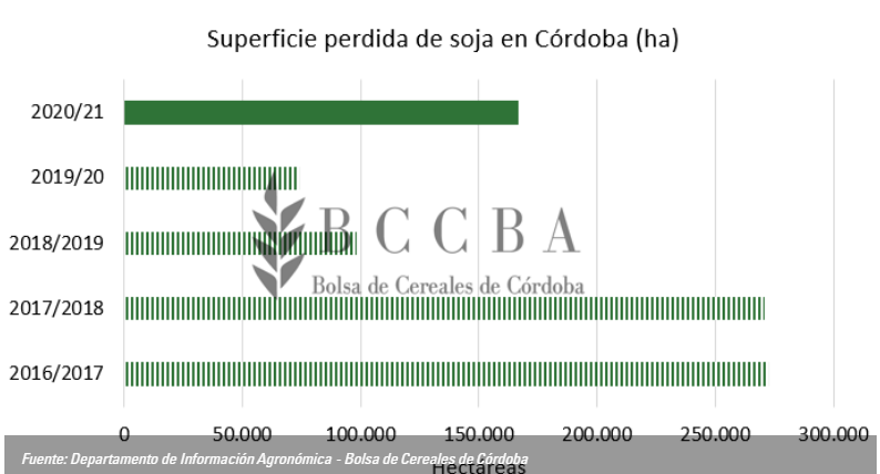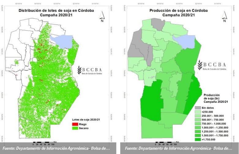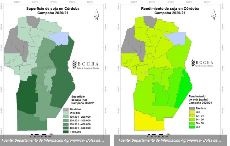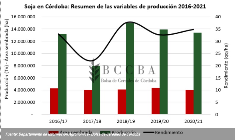 La superficie sembrada fue de 4.011.700 hectáreas y representa un 13 % menos que el promedio histórico 2007 – 2020. El motivo de esta disminución es principalmente el aumento del área sembrada con maíz en los últimos años y significa una mejora en las rotaciones. La mayor superficie se encuentra en los departamentos Río Cuarto y Marcos Juárez, mientras que el área bajo riego se concentra esencialmente en la zona norte de la provincia (departamentos Río Primero y Totoral).