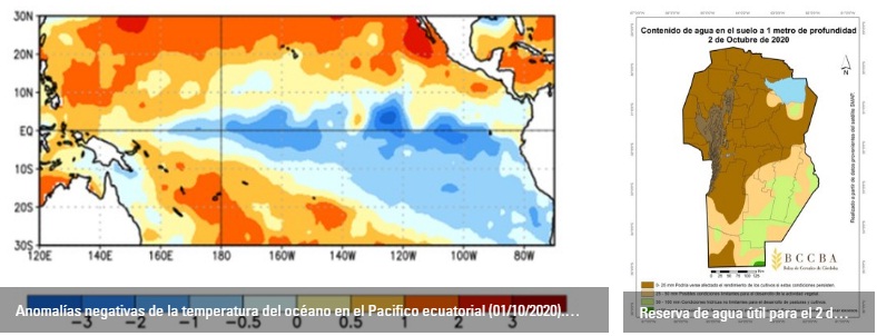 Al analizar la temperatura superficial del mar en el océano Pacífico ecuatorial, a inicios de la primavera austral en el año 2020, se evidenció que comenzó con anomalías negativas, lo que marcó el inicio de condiciones climáticas de La Niña, evento que se mantuvo hasta el mes de marzo. Es de importancia destacar que la provincia de Córdoba se caracteriza por tener precipitaciones por debajo de la media bajo condiciones de La Niña en este período.