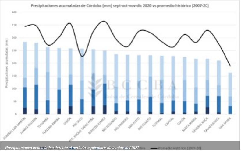 A inicios de enero del 2021 las condiciones de La Niña seguían presentes y se mantuvieron hasta marzo. Sin embargo, las precipitaciones en el periodo comprendido entre diciembre y marzo, que abarcó gran parte de la siembra de los cultivos estivales y el periodo crítico, tuvieron un régimen que igualó o superó los registros históricos en la mayoría de los departamentos en Córdoba, lo cual difiere a lo esperado para un evento La Niña.