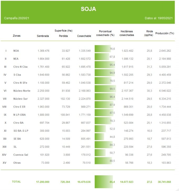 El avance nacional de cosecha se eleva al 85,4 % de la superficie apta. Con una producción acumulada de 38,7 MTn, el rin de medio nacional se ubica en 27,5 qq/Ha. La proyección para la campaña se mantiene en 43 MTn