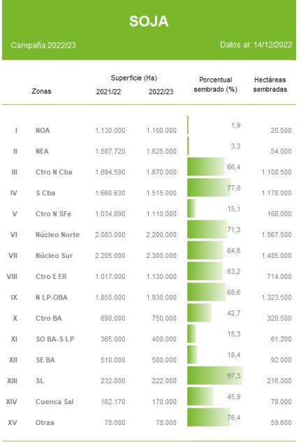 Finalmente, sobre ambos extremos del área agrícola, la falta de humedad impide el inicio de las labores de siembra sobre el NOA y NEA, mientras que, hacia el sur, la región depende de lluvias en el corto plazo para dar inicio a la implantación de cuadros de soja de segunda
