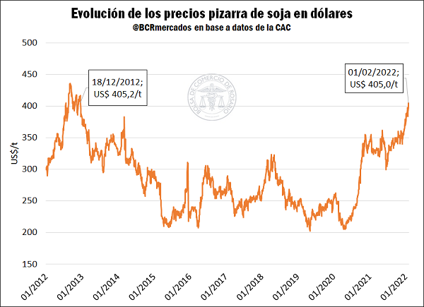 En la plaza rosarina, se destacaron las subas de la soja siguiendo la tónica alcista del mercado de referencia de Chicago. En este sentido y acorde a los registros de la Cámara Arbitral de Cereales de la Bolsa de Comercio Rosario, el valor más alto se alcanzó el martes a US$ 405/t. Cabe destacar que esta cotización es la máxima registrada desde mediados de diciembre de 2012. En adición, se observó un mayor número de posiciones de entrega por la mercadería del próximo ciclo comercial sobre el comienzo de la semana, con ofertas que también tendieron al alza.
