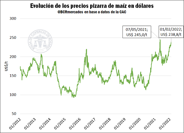 Respecto al maíz, se observó un incremento en el número de compradores en mercado en el comienzo de la semana, a diferencia de lo sucedido al cierre de la anterior, a la vez que se amplió el número de posiciones abiertas por parte del sector exportador, con posibilidades de entrega hasta el mes de agosto. Siguiendo el registro de la Cámara Arbitral de Cereales de Rosario, el valor más alto de la semana fue de US$ 238,8/t, un máximo de los últimos ocho meses. Respecto a las posiciones de la cosecha 2021/22, la mejor oferta de la semana para la posición marzo se ubicó en US$ 230/t, mientras que para el maíz tardío, los mayores valores ofrecidos fueron de US$ 210/t y US$ 200/t respectivamente para la descarga en el mes de junio y julio