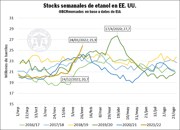 La evolución de las existencias de etanol muestra un enorme crecimiento en las últimas 5 semanas. Esto fue consecuencia del buen nivel de procesamiento de maíz y, por tanto, de la producción industrial de etanol, al tiempo que cayó la demanda del combustible en EE. UU. De este modo, se acumularon 5,2 millones de barriles en poco más de un mes, pasando de 20,7 millones de barriles de stock el pasado 24 de diciembre a 25,9 millones de barriles en el cierre de la semana del 28 de enero. En otras palabras, el alza en cuestión fue del 25% en apenas 5 semanas, pasando de mínimos en 5 campañas a máximos históricos para esta altura del año. Para poner un poco más en contexto a este último registro, sólo en 4 semanas se superó a esta cantidad de barriles en existencias y fueron las que correspondieron a abril del 2020, donde la pandemia de COVID-19 había golpeado con mayor fuerza al mercado de los combustibles y los futuros de petróleo más cercanos tuvieron valores negativos por primera vez en la historia.