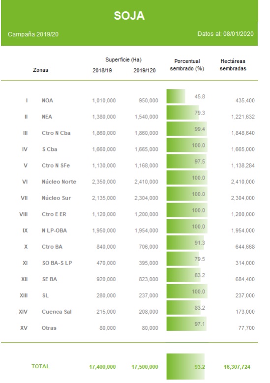 La siembra cubrió el 93,2% de la nueva proyección de 17,5 MHa. La soja de primera acumula un avance de 95,3% mientras que los planteos de segunda cubren el 30,8% de la superficie.