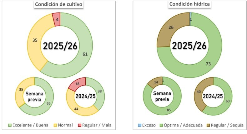 A nivel nacional, se registra un incremento intersemanal de 11,7 puntos porcentuales en la superficie con condición hídrica Regular a Sequía, una señal que marca un cambio en el balance de humedad de los suelos. Por ahora, este deterioro no se traduce en un impacto directo sobre el estado de los cultivos: el 95 % de la soja implantada se mantiene en condición Normal a Buena.