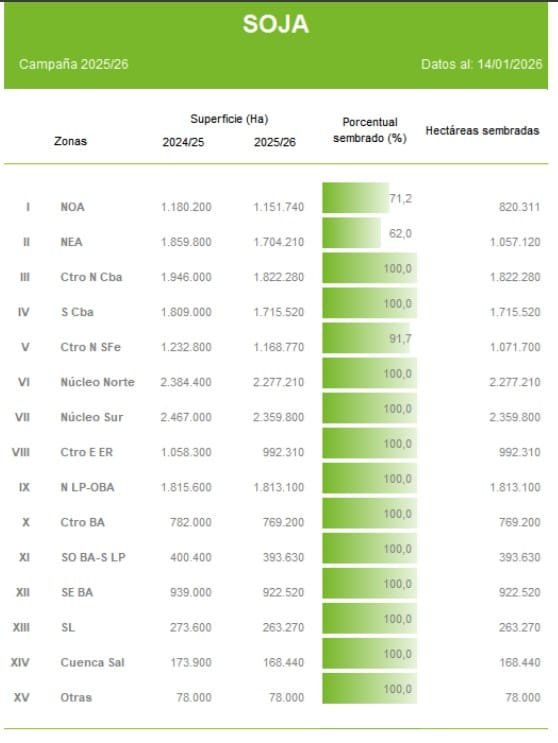 La campaña de soja 2025/26 avanza con números sólidos en gran parte del país y ya alcanza el 93,9 % del área prevista. El ritmo de implantación se mantiene elevado, aunque las condiciones climáticas comienzan a introducir contrastes que obligan a seguir de cerca la evolución del cultivo.