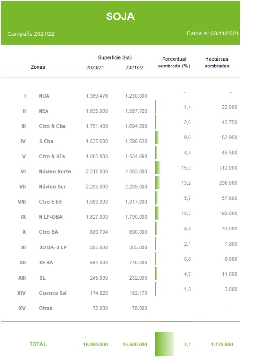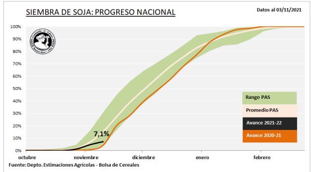 Con un avance intersemanal de 2,5 puntos, el progreso nacional de siembra se eleva a 7,1 puntos, representando casi 1,2 de las 16,5 MHa proyectadas para la campaña 2021/22.