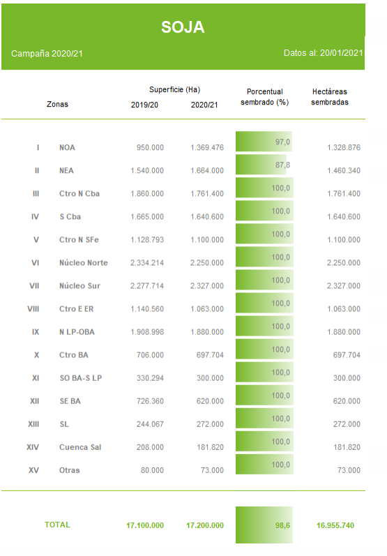 El progreso nacional de siembra se eleva al 98,6% de las 17,2 MHa proyectadas para la campaña 2020/21. Solo restan por incorporar 244mHa sobre el norte del área agrícola