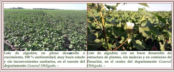 Las condiciones climáticas, con elevadas temperaturas y humedad, en ambientes y suelos, que sumadas a las precipitaciones registradas al final del período, beneficiaron el crecimiento del algodón. Por ello, se observó un 90 % en estado bueno con lotes excelentes, un 8 % en estado regular y un 2 % en estado malo.