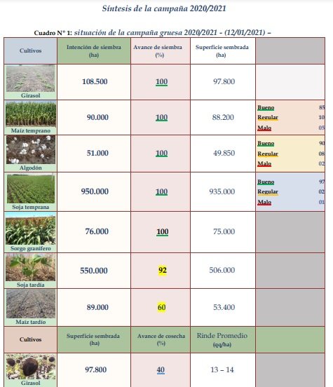 Un 85 % de los cultivares se encontraron en buen estado, con lotes excelentes, sin inconvenientes para su normal desarrollo, regular el 10 %, en los últimos quince días padecieron las altas temperaturas y la escasa disponibilidad de agua, que con el transcurso de las jornadas se acentuaron aún más, deteriorándose y variando así su estado, un 5 % pasó a malo, con marcados síntomas de estrés termo-hídrico y con mortandad de plantas.