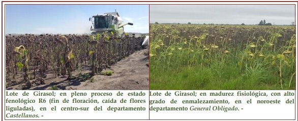 El enmalezamiento de los distintos sitios continuó siendo el principal inconveniente que enfrentaron los productores, al momento de la cosecha, como consecuencia del menor desarrollo de las plantas, lo que favoreció la aparición de malezas, dada la mayor luminosidad entre surcos, por lo que efectuaron aplicaciones de herbicidas, antes de la recolección. Hasta el momento se observó muy buena sanidad, sin inconvenientes, pero en lotes más avanzados, en estadio de fructificación, continuaron observándose daños por ataques de palomas y de cotorras, principalmente en los departamentos del centro y sur del área de estudio. Se detectaron los siguientes estados fenológicos; R “estados reproductivos”, R6 (fin de floración, caídas de flores liguladas), R7 (la parte de atrás del capítulo comenzó a ponerse amarillento) y en lotes más avanzados, en R9 “madurez fisiológica” (parte de atrás del capítulo y las brácteas de color amarillento a marrón oscuro).