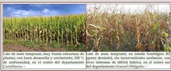 Se observaron los siguientes estados fenológicos: V “estados vegetativos” en un bajo porcentaje, en Vt (panojamiento) y el resto en R “estados reproductivos”, R1 (emergencia de estigma), R2 (cuaje-ampolla), R3 (grano lechoso), R4 (grano pastoso) y en lotes más avanzados, en R5 (grano dentado).