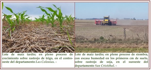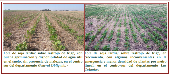 La siembra de la soja tardía logró un grado de avance del 92 %, representando unas 506.000 ha, con un ritmo de maquinarias muy dispar, según zonas y departamentos del área de estudio. La irregular disponibilidad de agua útil en la cama de siembra, las altas temperaturas diarias, vientos y activos procesos de evapotranspiración, con el transcurso de los días fueron condicionando y regulando la implantación, la que se interrumpió en algunos departamentos y en otros, particularmente en el centro oeste – noroeste avanzó, reflejando un incremento intersemanal de 2 puntos porcentuales.