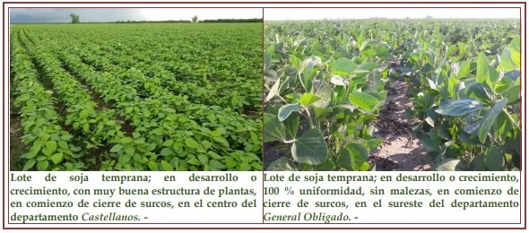 Particularmente, en los departamentos del norte, en algunos lotes puntuales se observó la presencia del picudo grande de la soja (Sternechus pinguis), situación que exigió u obligó a continuas inspecciones. Los sojales se detectaron en muy buen estado, con un normal crecimiento, una buena germinación o emergencia y stand de plantas, por unidad de superficie. Una observación y particularidad de la presente campaña en comparación a la anterior para el mismo período, mostraría que un 75 a 80 % de los cultivares tuvieron un menor desarrollo de estructura de plantas, menor altura y recién a los 12 a 15 días del mes de enero, comenzaron el cierre de los surcos, situación que en el ciclo anterior se había logrado a fines de diciembre, con mejor estructura y altura de los mismas. Se detectaron, los siguientes estados fenológicos: V “estados vegetativos”, V4 (4º nudo), V5 (5º nudo), V6 (6º nudo), V7 (7º nudo), V8 (8º nudo) y lotes más avanzados, en V9 (9º nudo).