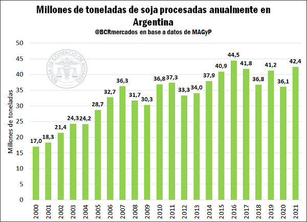 El complejo de soja de Argentina se sustenta en buena medida en una industria de reconocida importancia a nivel internacional. La faceta industrial dentro del entramado productivo de la soja lleva a nuestro país a ser el principal exportador de harinas y aceites de esta oleaginosa, al tiempo que contribuye enormemente en la generación de divisas dentro de la balanza comercial argentina. Por ello, el nivel de procesamiento o crushing local adquiere una notoria relevancia a la hora de evaluar el desempeño del sector.
