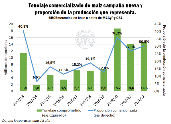 Por otra parte, esta fuerte caída registrada en las proyecciones productivas del maíz generó indirectamente un incremento en la proporción del cereal de la campaña 2021/22 comercializada. En este sentido, al pasarse de una estimación de 56 Mt (en diciembre) a las 48 Mt que se prevén actualmente, la oferta del cereal se reduce frente a los compromisos ya pactados, por lo que implica un estrechamiento de la capacidad de abastecimiento del mercado del maíz. En este sentido, actualmente se llevan comercializadas 14,6 Mt de la próxima cosecha del cereal, representando actualmente el 30,5% de la producción nacional. Si las proyecciones se hubiesen mantenido constantes esto representaría una comercialización equivalente al 26,1% del ciclo 2021/22. Tanto el tonelaje en términos absolutos, como en relación a la producción se encuentran en niveles elevados en comparación a lo sucedido en los últimos años. El promedio de las últimas 5 campañas resulta en compromisos equivalentes a 10,3 Mt, mientras que representarían el 22,1% de la producción promedio de dicho período, por lo cual, la cosecha 2021/22 se encuentra casi 4,3 Mt por encima del promedio y en 8,4 puntos porcentuales como proporción de sus estimaciones productivas.