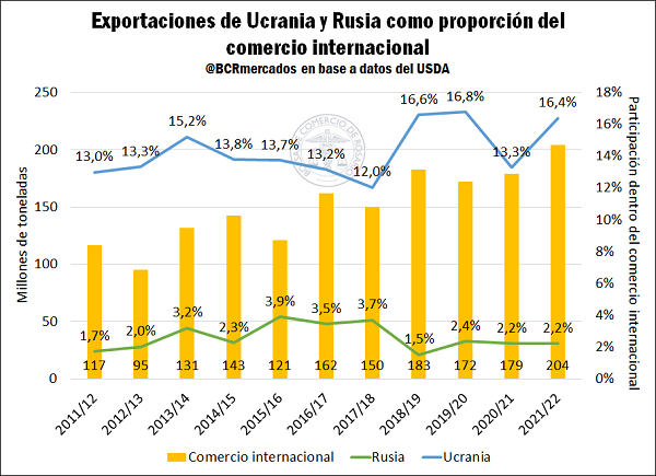 Por un lado, la tensión militar que se está dando en la región del Mar Negro, más precisamente entre Ucrania y Rusia, generan incertidumbre en el mercado de internacional de commodities agrícolas. Esto es consecuencia de la importancia de la producción cerealera de la región ya que, Ucrania y Rusia representan el 16% y el 2% de las exportaciones mundiales del maíz, respectivamente. Además, el tonelaje remitido al exterior ha ido incrementándose de la mano de un comercio internacional cada vez más voluminoso. En este sentido, se espera que en el ciclo 2021/22 se exporten mundialmente 204 Mt, superando al previo récord de 183 Mt que se dio en la campaña 2018/19. Si bien la región productiva se encuentra alejada del territorio donde se da la tensión, podrían darse complicaciones logísticas debido a la zona de influencia del conflicto y la ubicación de los principales puertos exportadores de este territorio.