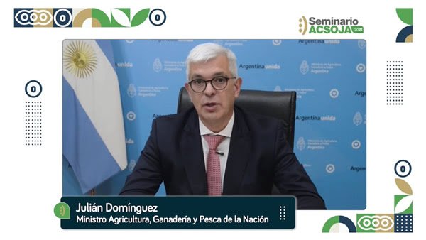 El ministro de Agricultura, Ganadería y Pesca de la Argentina, Julián Domínguez, participó hoy de la apertura del Seminario Acsoja 2021, en lo que fue su primera aparición pública desde que juró en el cargo este lunes.