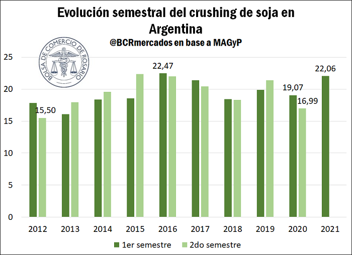 En el segundo semestre de 2020, el crushing de soja sufrió una merma importante debido a diversos factores (conflictos gremiales que afectaron el funcionamiento de los puertos y un impacto aún relevante de la pandemia sobre la economía), arribando a un procesamiento de solo 16,99 Mt. Tal valor se ubicó muy por detrás de lo alcanzado el año previo y en valores mínimos desde el año 2012.