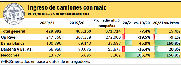 Cabe señalar, además, que el territorio con mayores retrasos en la cosecha es Córdoba, la provincia líder en producción que aportará más del 40% del maíz argentino en la 2020/21. Las cosechadoras cordobesas han avanzado a la fecha sobre el 72% de los lotes, lejos aún del 98% logrado a igual fecha del año pasado. Santa Fe, otro importante origen del maíz de la región centro de argentina, ha completado el 89% de su cosecha, apenas por detrás de lo logrado el ciclo anterior (92%). Por su parte, Buenos Aires, que destina parte de su producción a los puertos fluviales del norte de la provincia y otra parte a los marítimos del sur, ha avanzado sobre el 88% de su superficie sembrada mejorando el ritmo del año anterior. El progreso de la cosecha en las principales regiones maiceras del país impacta de lleno, a su vez, en el ingreso estimado de camiones a los puertos argentinos.