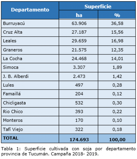 El Laboratorio de Sistema de Información Territorial del INTA Famaillá determinó que la superficie total implantada con soja en la provincia para la campaña 2018-2019 fue de 174.693 ha (Figura 1).