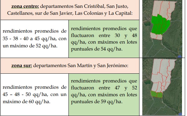 Ante ello, en los departamentos del sur del área de estudio, comenzó el proceso de cosecha en los primeros lotes, con resultados muy variados desde muy buenos a regulares y malos. En promedio, con mínimos de 25 – 28 qq/ha y máximos de 32 – 35 qq/ha, con cuadros puntuales de 38 qq/ha.