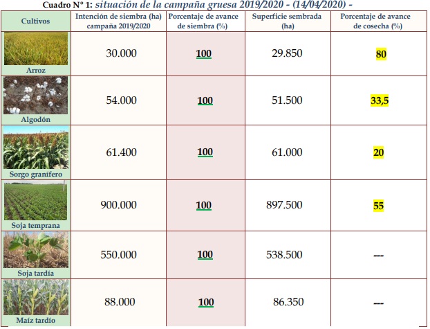 El proceso de cosecha avanzó a ritmo constante en la semana, con el paso de los días la estabilidad climática permitió un progreso del orden del 55 %, con un incremento semanal de 21 puntos y un retraso de 13 puntos en comparación al mismo período de la campaña 2018/2019.