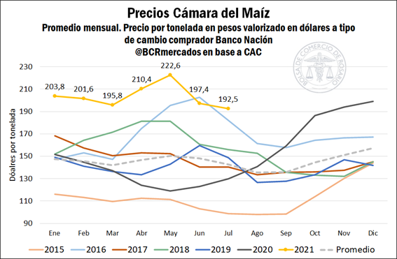 No obstante, a partir de mayo los precios del maíz evidenciaron una tendencia decreciente y perforaron la barrera de los US$ 200/t a mediados del mes pasado. En la última semana han recuperado algo de terreno, y cotizan actualmente por encima de US$ 190/t. A pesar de la baja que tuvo lugar a partir de mayo, los valores de junio y lo que va de julio no difieren significativamente de los observados en el año récord 2016.