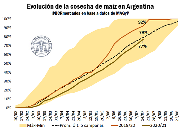 Las provincias de Buenos Aires y Santa Fe, que concentran el 26% y el 12% del área total de maíz respectivamente, ya tiene cerca del 90% de su superficie cosechada y apuntalan el promedio. No obstante, la principal provincia maicera del país, Córdoba, lleva cosechados el 72% de sus lotes, concentrando más del 30% de las hectáreas sembradas con el grano amarillo. Los elevados niveles de humedad de los granos en la provincia mediterránea retrasan el avance.